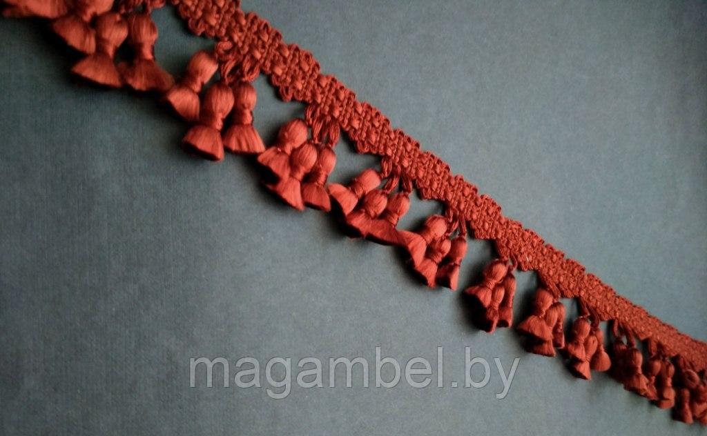 Бахрома декоративная для штор цвета терракоты отлично украсит край портьеры, гардины или подушечки. Высота бахромы 5 см. Состав 100% ПЭ.