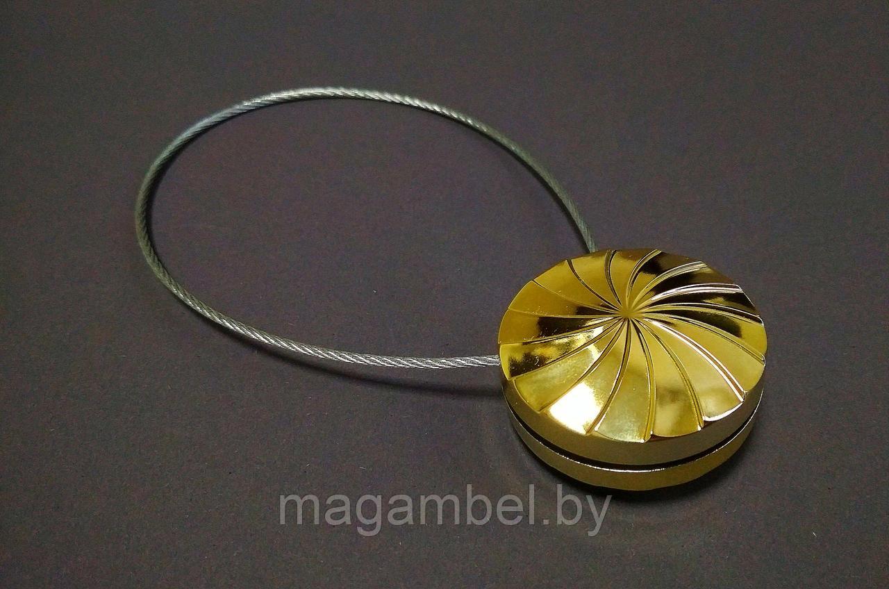 Подхват магнитный для портьер и гардин на тросе в цвете золото блестящее. Диаметр декора 45 мм, длина троса 24 см.