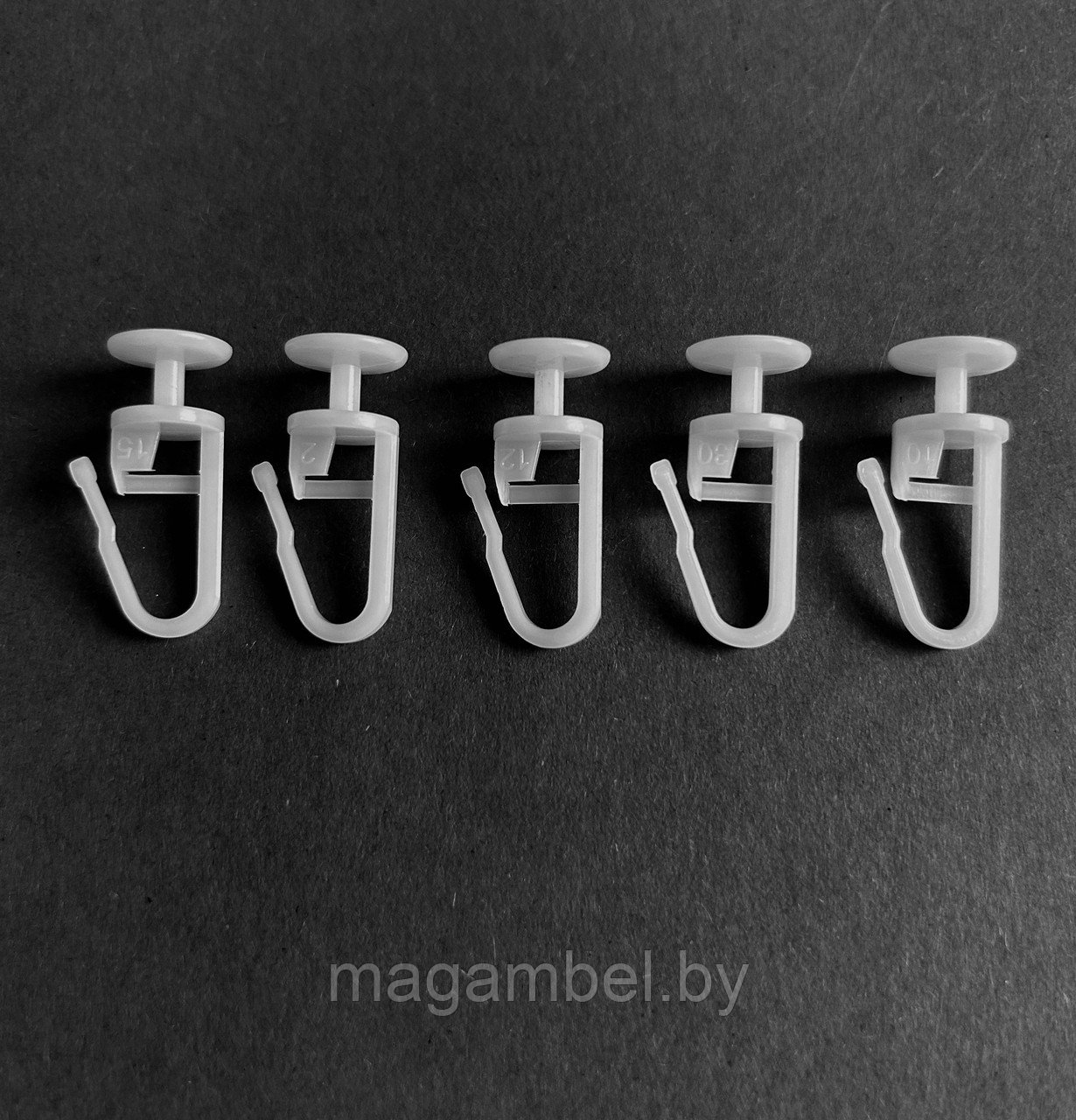 Защелкивающийся крючок для навешивания портьер и гардин на потолочный пластиковый карниз. Высота крючка 2,8 см, выполнен из пластика.